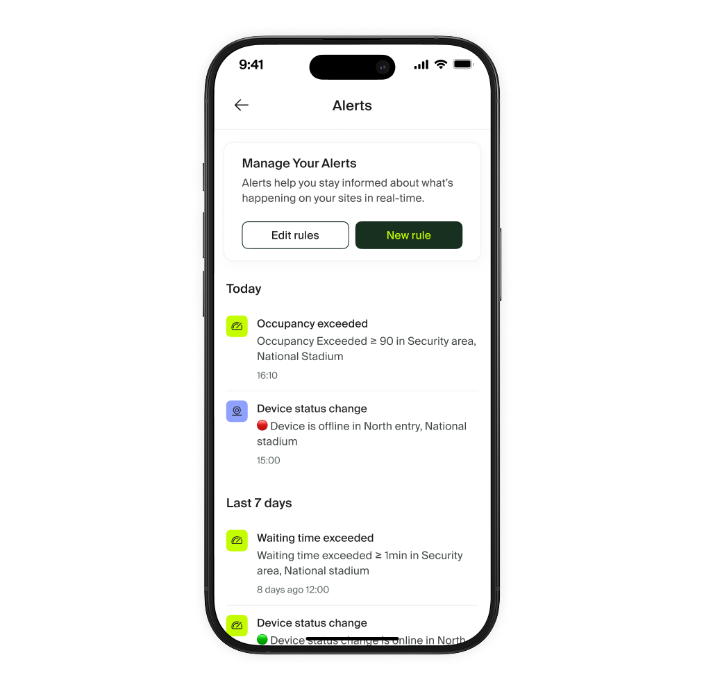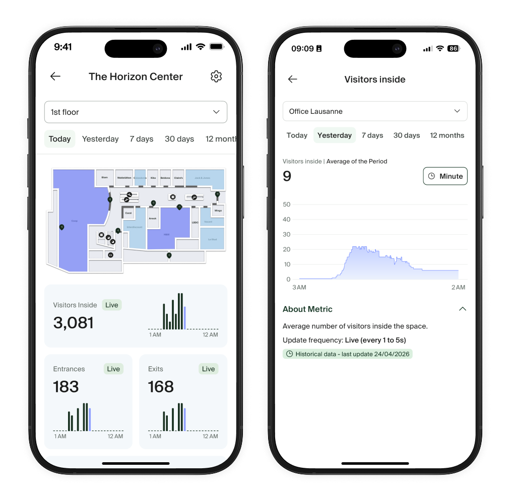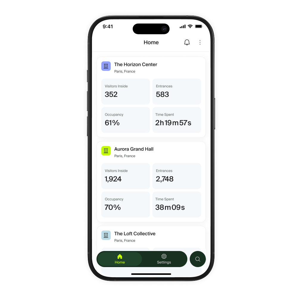 Détails du site et des indicateurs L'écran du site vous offre une vue de tous les indicateurs disponibles pour votre site en temps réel. Utilisez les filtres temporels pour basculer entre différentes plages de temps afin de comparer rapidement les données historiques. Appuyez sur un indicateur pour voir le graphique en détail. En bas de l'écran, vous trouverez un aperçu des données pour les sous-zones et les passages de la zone actuelle. Appuyez sur ⚙️ Paramètres pour accéder aux appareils liés au site ou ajuster les comptages internes. |