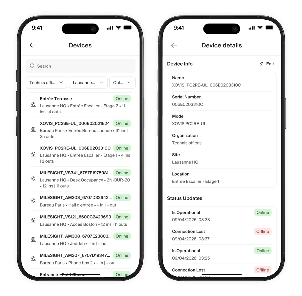 - Surveiller l'état des appareils, relier les appareils à différentes zones et passages, ou configurer les tapis de comptage intelligents Intechfloor.