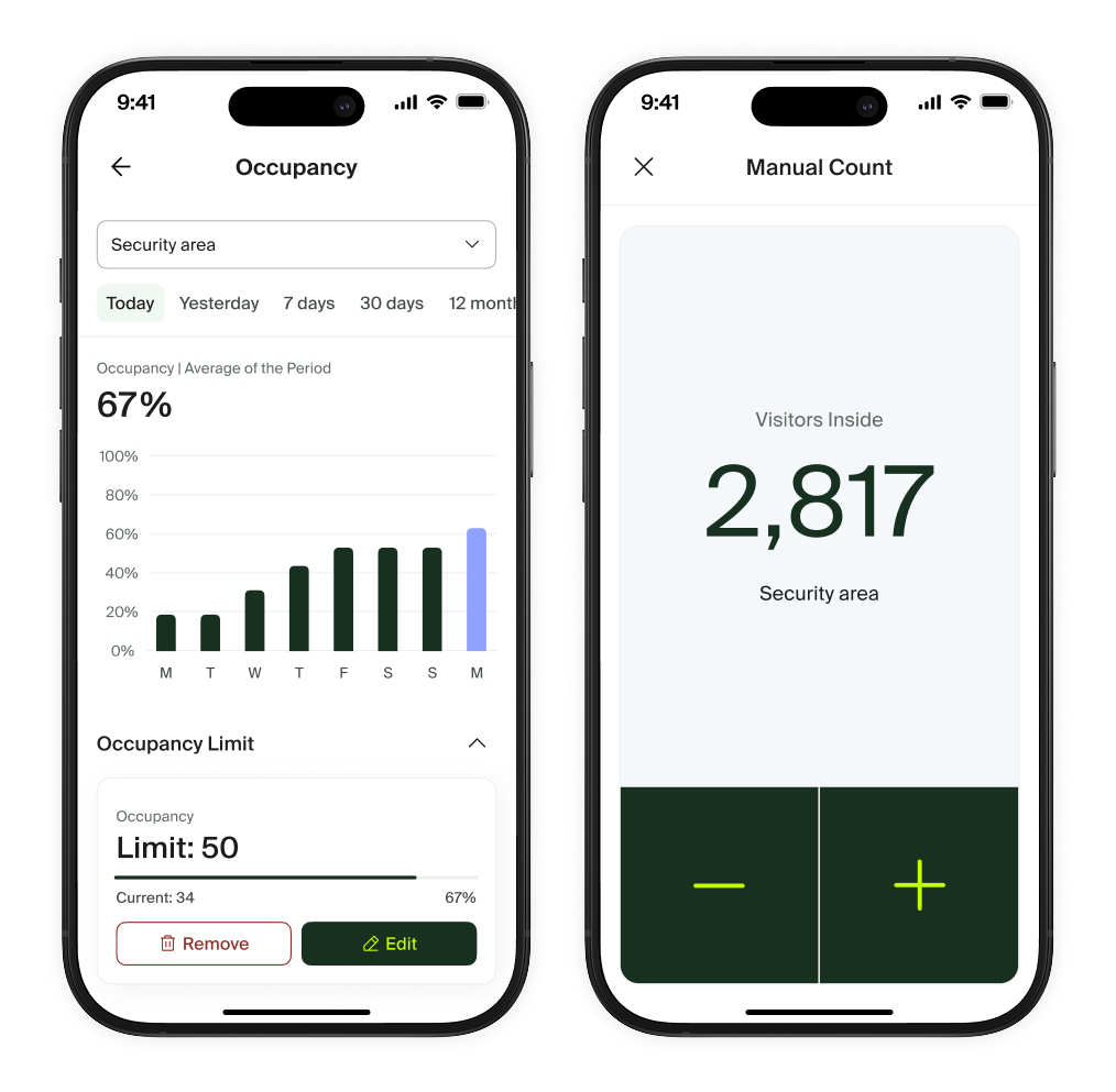 Gestion de l'occupation Pour vous aider à gérer le flux de personnes lors d'événements, appuyez sur l'indicateur Occupation sur n'importe quel site. À partir de là, vous pouvez consulter et définir la limite. Si les comptages dérivent, vous pouvez soit modifier le nombre de personnes actuellement observé dans la zone, soit utiliser le compteur manuel. |