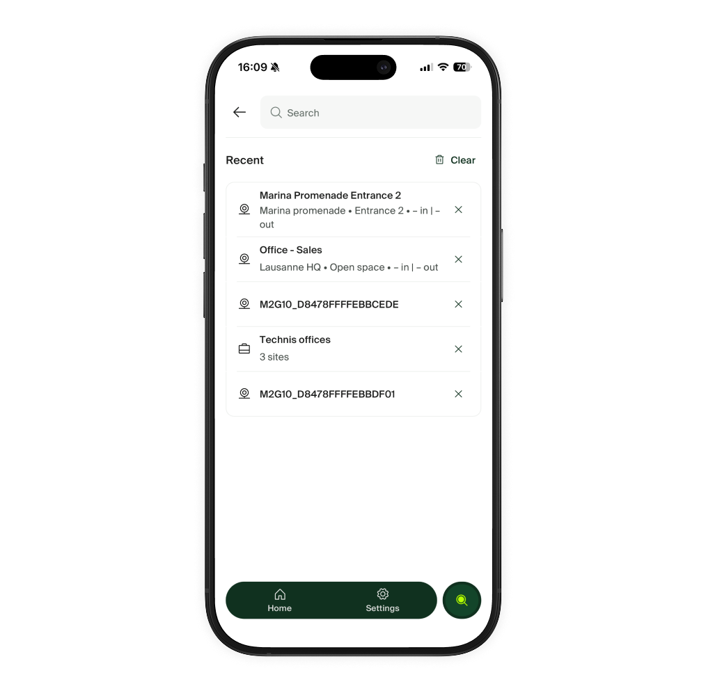 Gestion des capteurs Effectuez un contrôle rapide de l'état de vos capteurs ou modifiez leur position sur le site en déplacement. Vous pouvez accéder à la liste des capterus soit en appuyant sur l'icône ⚙️ Paramètres en haut de chaque site, soit en allant dans Paramètres > Mes capterus depuis la barre de navigation principale. |
