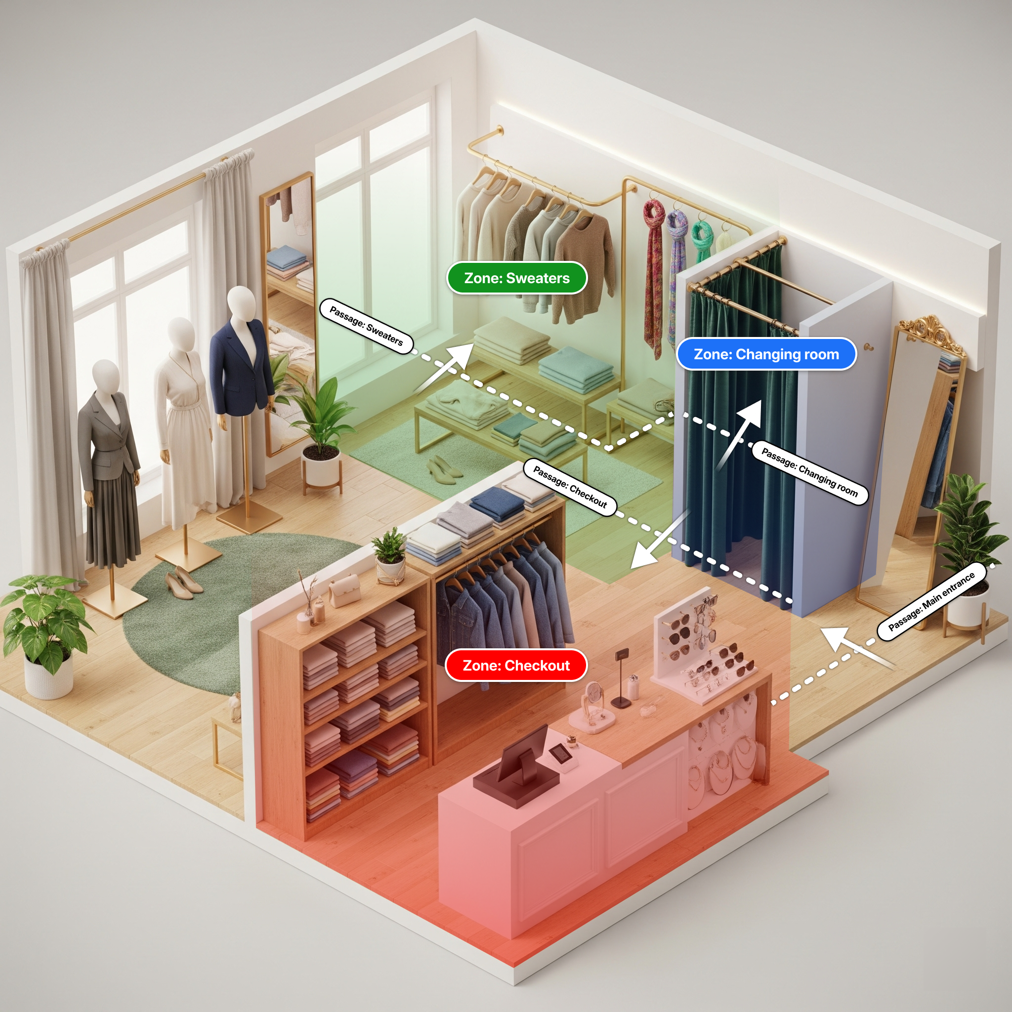 Les passages sont essentiels à un comptage précis. Un passage est un chemin entre deux zones et correspond généralement à l’endroit où vous installez un capteur (ou à la zone qu’il observe) pour détecter les mouvements.